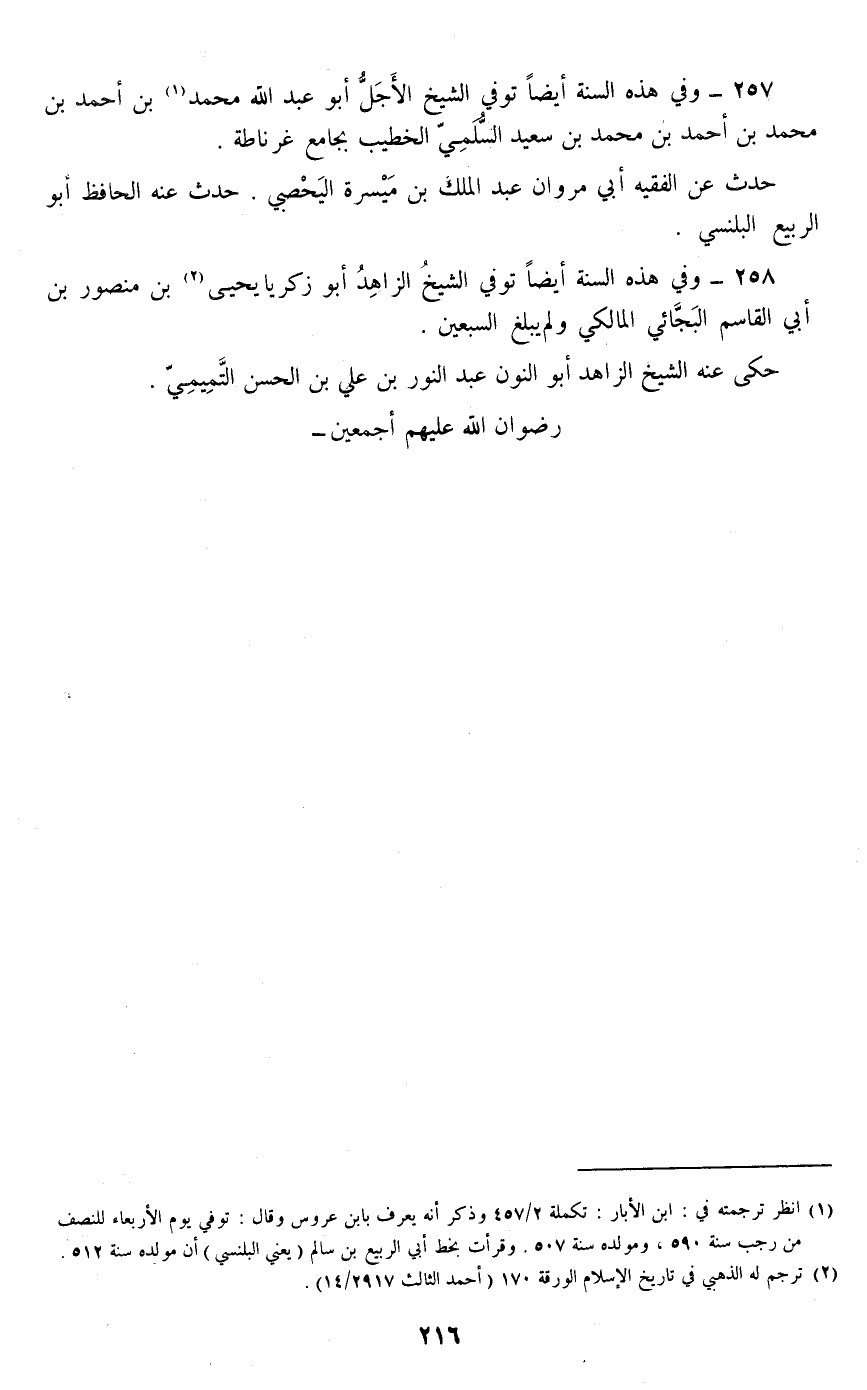 257 - وفي هذه السنة أيضا توفي الشيخ الأجل أبو عبد الله محمد بن أحمد بن محمد بن أحمد بن محمد بن سعيد السلمي الخطيب بجامع غرناطة.