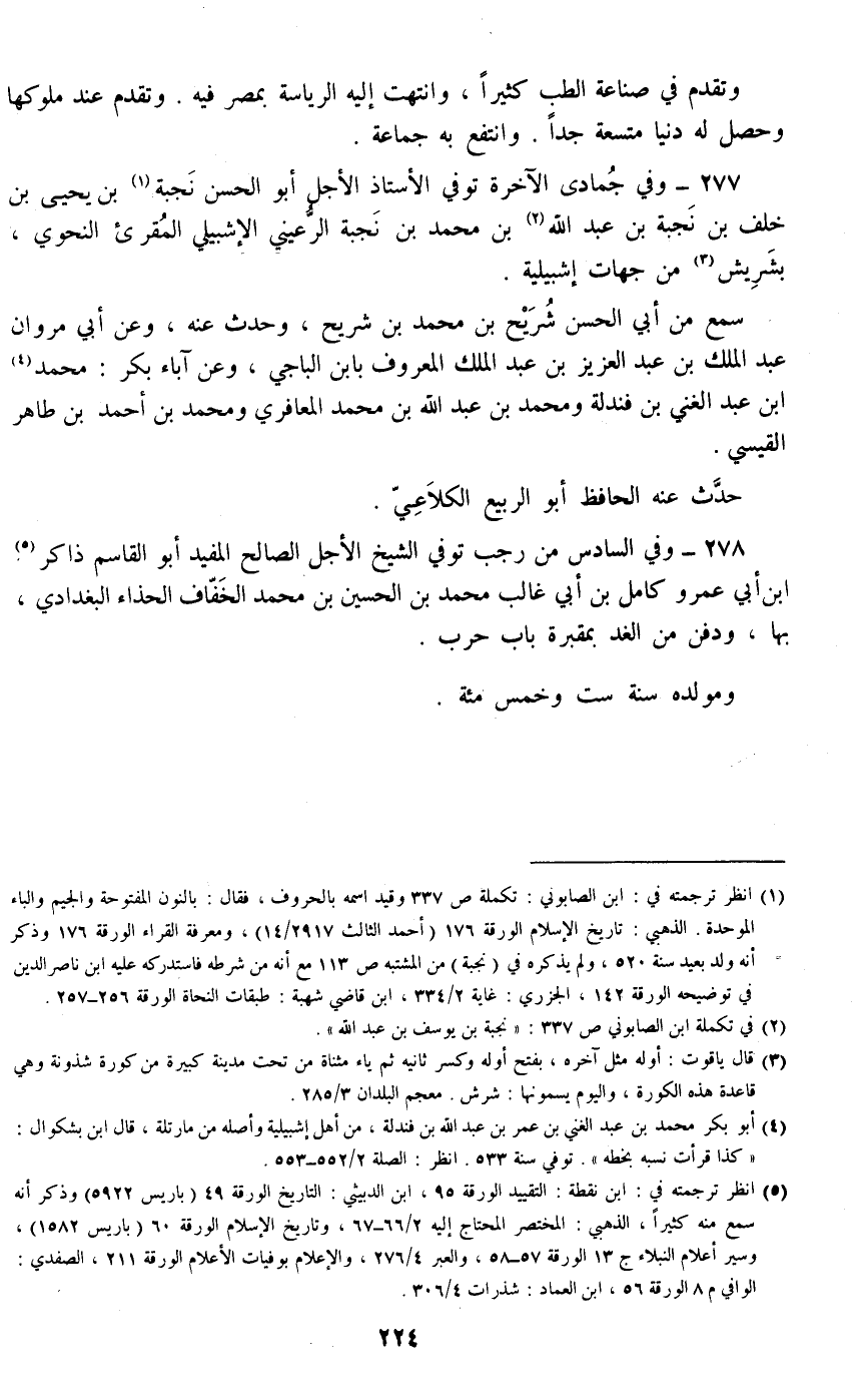 277 - وفي جمادى الآخرة توفي الأستاذ الأجل أبو الحسن نجبة بن يحيى بن خلف بن نجبة بن عبد الله بن محمد بن نجبة الرعيني الإشبيلي المقرئ النحوي، بشريش من جهات إشبيلية.