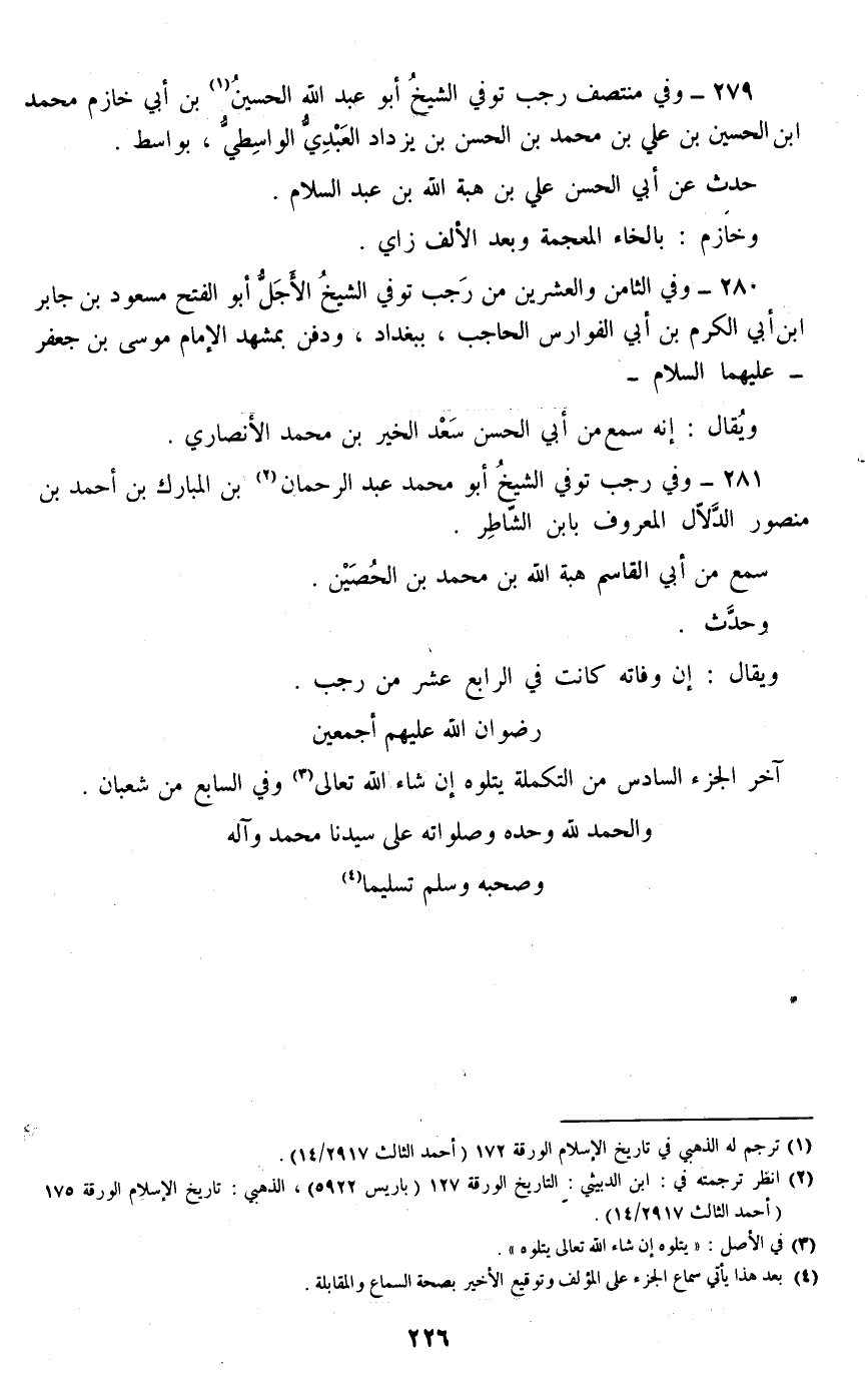 280 - وفي الثامن والعشرين من رجب توفي الشيخ الأجل أبو الفتح مسعود بن جابر بن أبي الكرم بن أبي الفوارس الحاجب، ببغداد، ودفن بمشهد الإمام موسى بن جعفر –عليهما السلام-