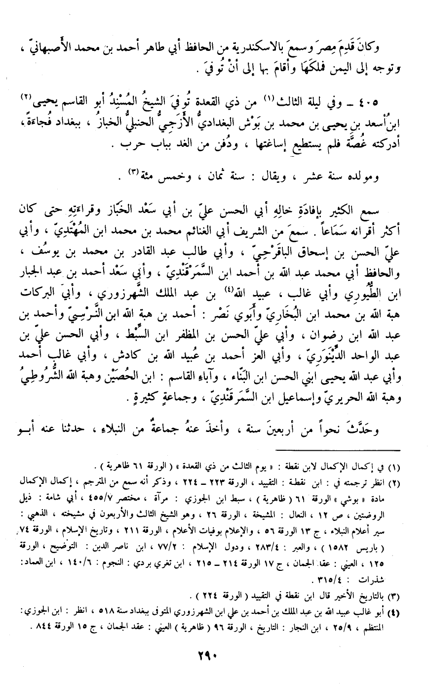 405 - وفي ليلة الثالث من ذي القعدة توفي الشيخ المسند أبو القاسم يحيى بن أسعد بن يحيى بن محمد بن بوش البغدادي الأزجي الحنبلي الخباز، ببغداد فجاءة، أدركته غصة فلم يستطيع إساغتها، ودفن من الغد بباب حرب.