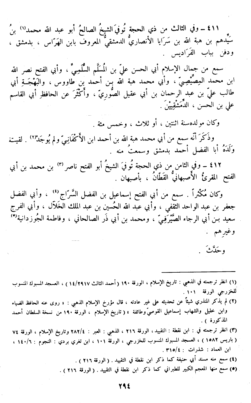 411 - وفي الثالث من ذي الحجة توفي الشيخ الصالح أبو عبد الله محمد بن سيدهم بن هبة الله بن سرايا الأنصاري الدمشقي المعروف بابن الهراس، بدمشق، ودفن بباب الفراديس.