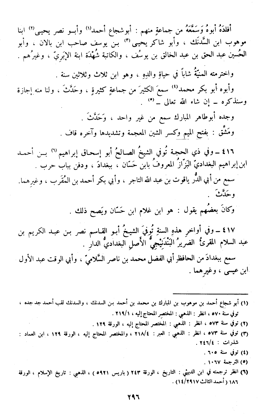 417 - وفي أواخر هذه السنة توفي الشيخ أبو القاسم نصر بن عبد الكريم بن عبد السلام المقرئ الضرير البندنيجي الأصل البغدادي الدار