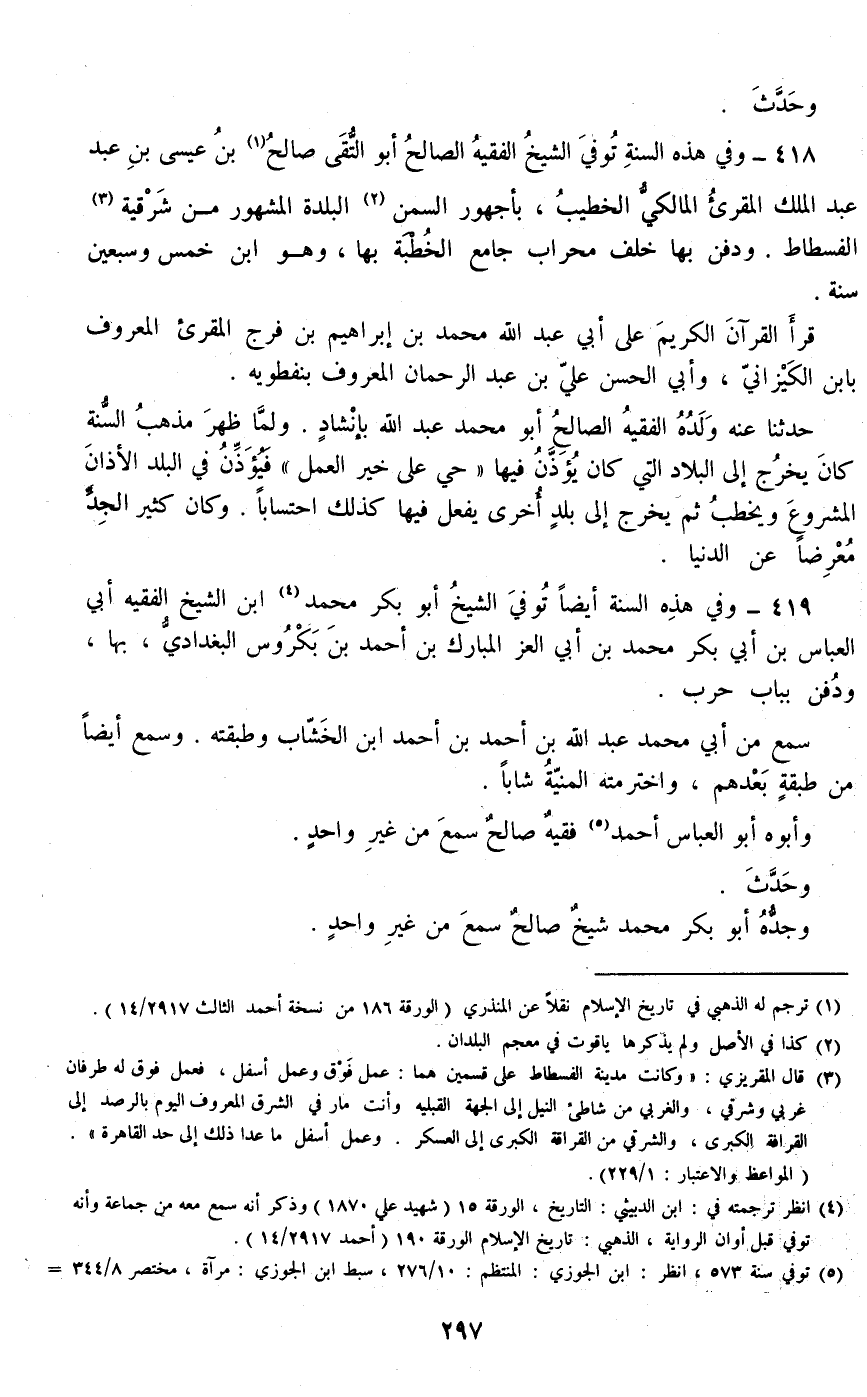 419 - وفي هذه السنة أيضا توفي الشيخ أبو بكر محمد ابن الشيخ الفقيه أبي العباس بن أبي بكر محمد بن أبي العز المبارك بن أحمد بن بكروس البغدادي، بها ودفن بباب حرب.