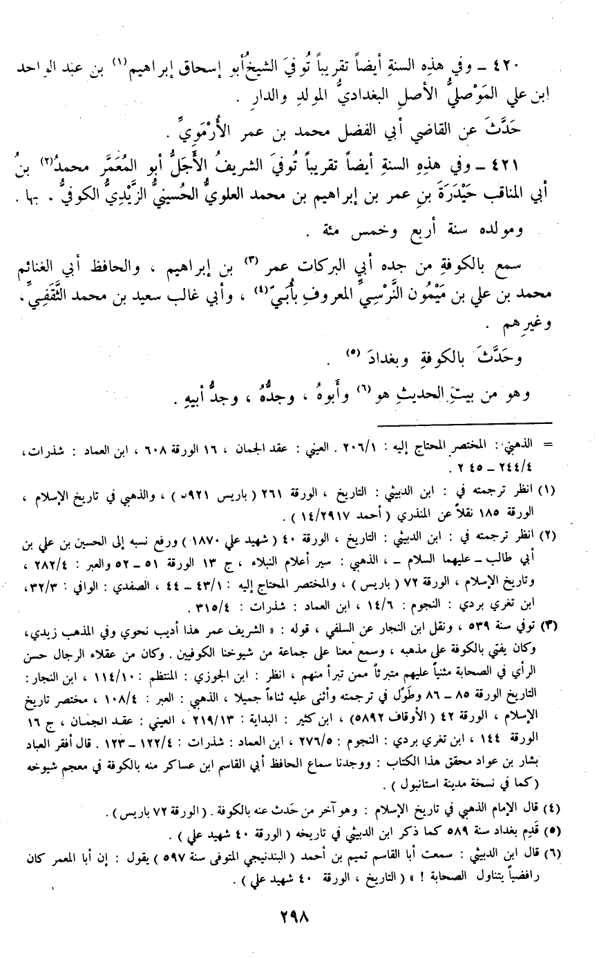 421 - وفي هذه السنة أيضا تقريبا توفي الشريف الأجل أبو المعمر محمد بن أبي المناقب حيدرة بن عمر بن إبراهيم بن محمد العلوي الحسيني الزيدي الكوفي، بها.