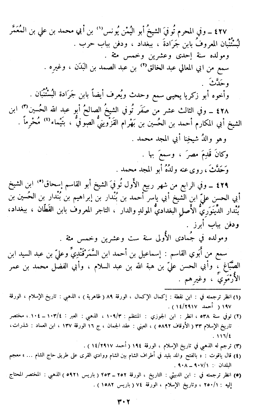 427 - وفي المحرم توفي الشيخ أبو اليمن يونس بن أبي محمد بن علي بن المعمر لبستنبان المعروف بابن جرادة، ببغداد، ودفن بباب حرب.