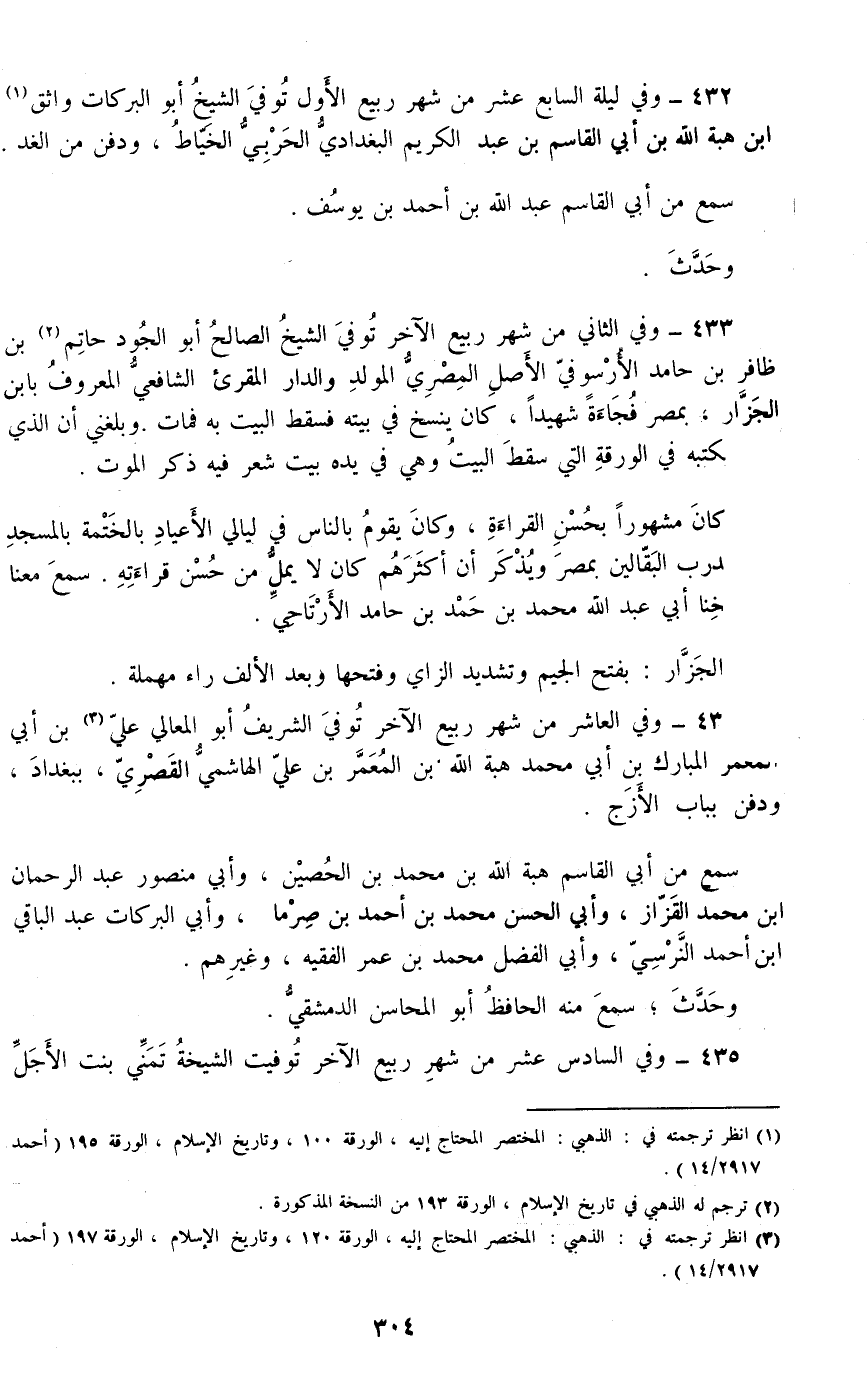 435 - وفي السادس عشر من شهر ربيع الآخر توفيت الشيخة تمني بنت الأجل أبي حفص عمر بن إبراهيم بن الحسين بن عيسى الطيبي الجمري البغدادي الأزجي، #305# ببغداد، ودفنت بباب حرب.