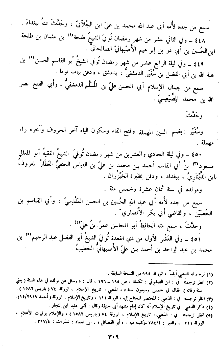 448 - وفي الثاني عشر من شهر رمضان توفي الشيخ طلحة بن عثمان بن طلحة بن الحسين بن أبي ذر بن إبراهيم الأصبهاني الصالحاني