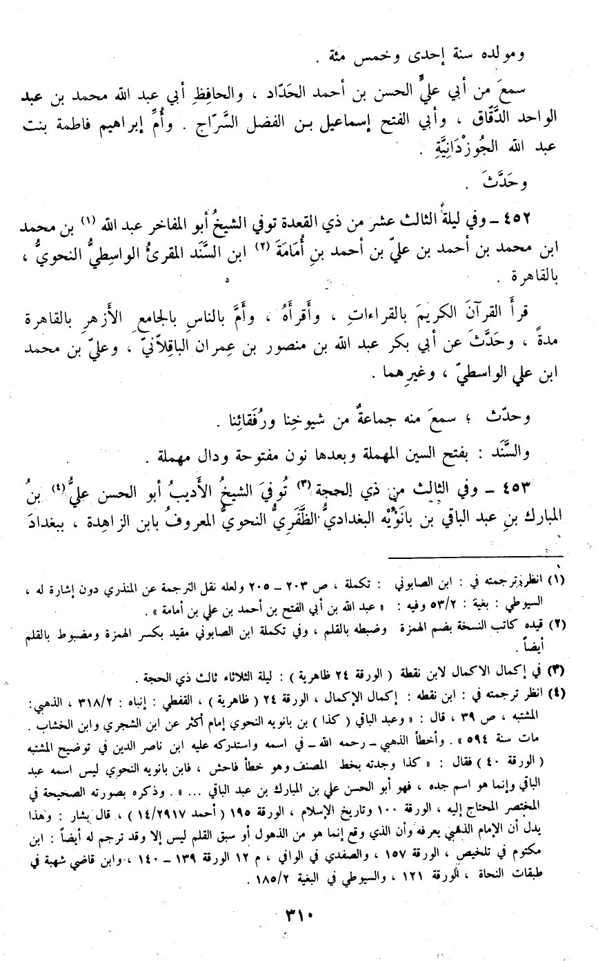 453 - وفي الثالث من ذي الحجة توفي الشيخ الأديب أبو الحسن علي بن المبارك بن عبد الباقي بن بانويه البغدادي الظفري النحوي المعروف بابن الزاهدة، ببغداد #311# ودفن عند والدته الزاهدة برباط لهم بالظفرية.