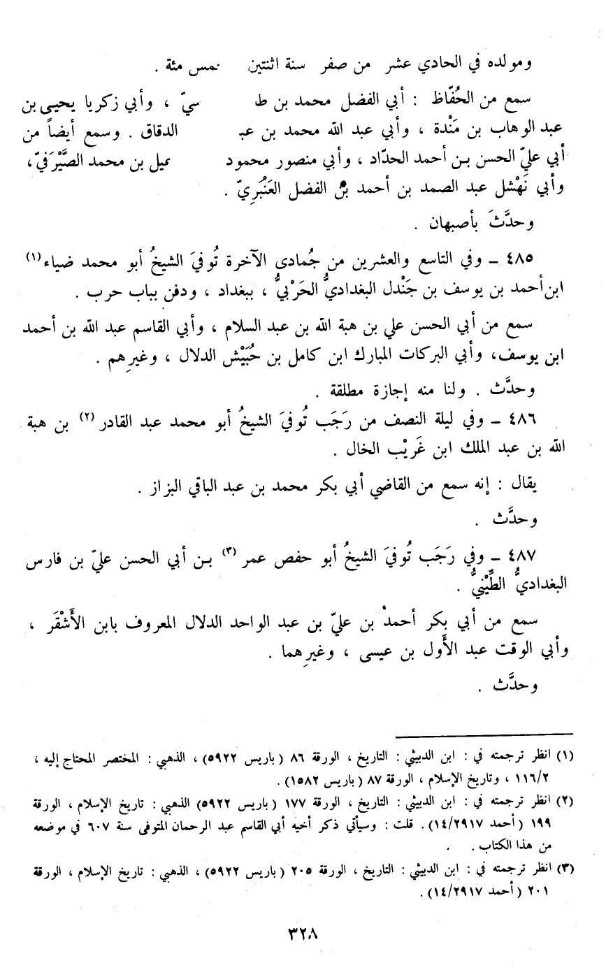 485 - وفي التاسع والعشرين من جمادى الآخرة توفي الشيخ أبو محمد ضياء بن أحمد بن يوسف بن جندل البغدادي الحربي، ببغداد، ودفن بباب حرب.