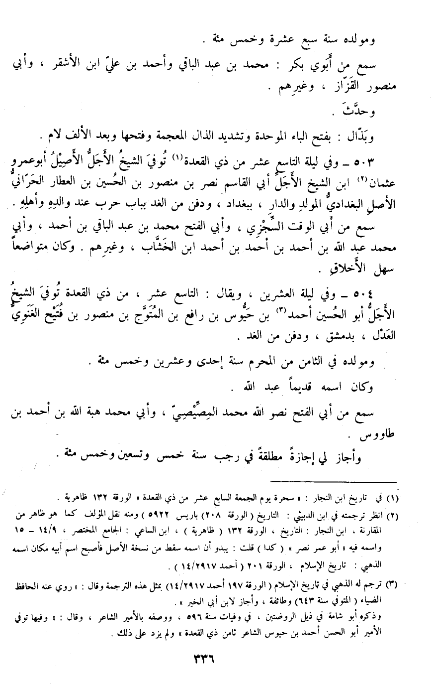 503 - وفي ليلة التاسع عشر من ذي القعدة توفي الشيخ الأجل الأصيل أبو عمرو عثمان ابن الشيخ الأجل أبي القاسم نصر بن منصور بن الحسين بن العطار الحراني الأصل البغدادي المولد والدار، ببغداد، ودفن من الغد بباب حرب عند والده وأهله.
