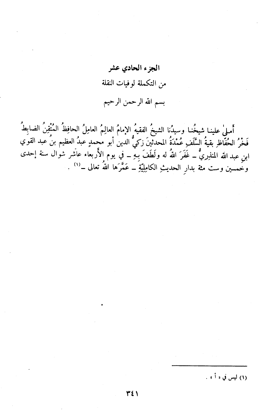 أملى علينا شيخنا وسيدنا الشيخ الفقيه الإمام العالم العامل الحافظ المتقن الضابط فخر الحفاظ بقية السلف عمدة المحدثين زكي الدين أبو محمد عبد العظيم بن عبد القوي بن عبد الله المنذري -غفر الله له ولطف به- في يوم الأربعاء عاشر شوال سنة إحدى وخمسين وست مئة بدار الحديث الكاملية -عمرها الله تعالى-.