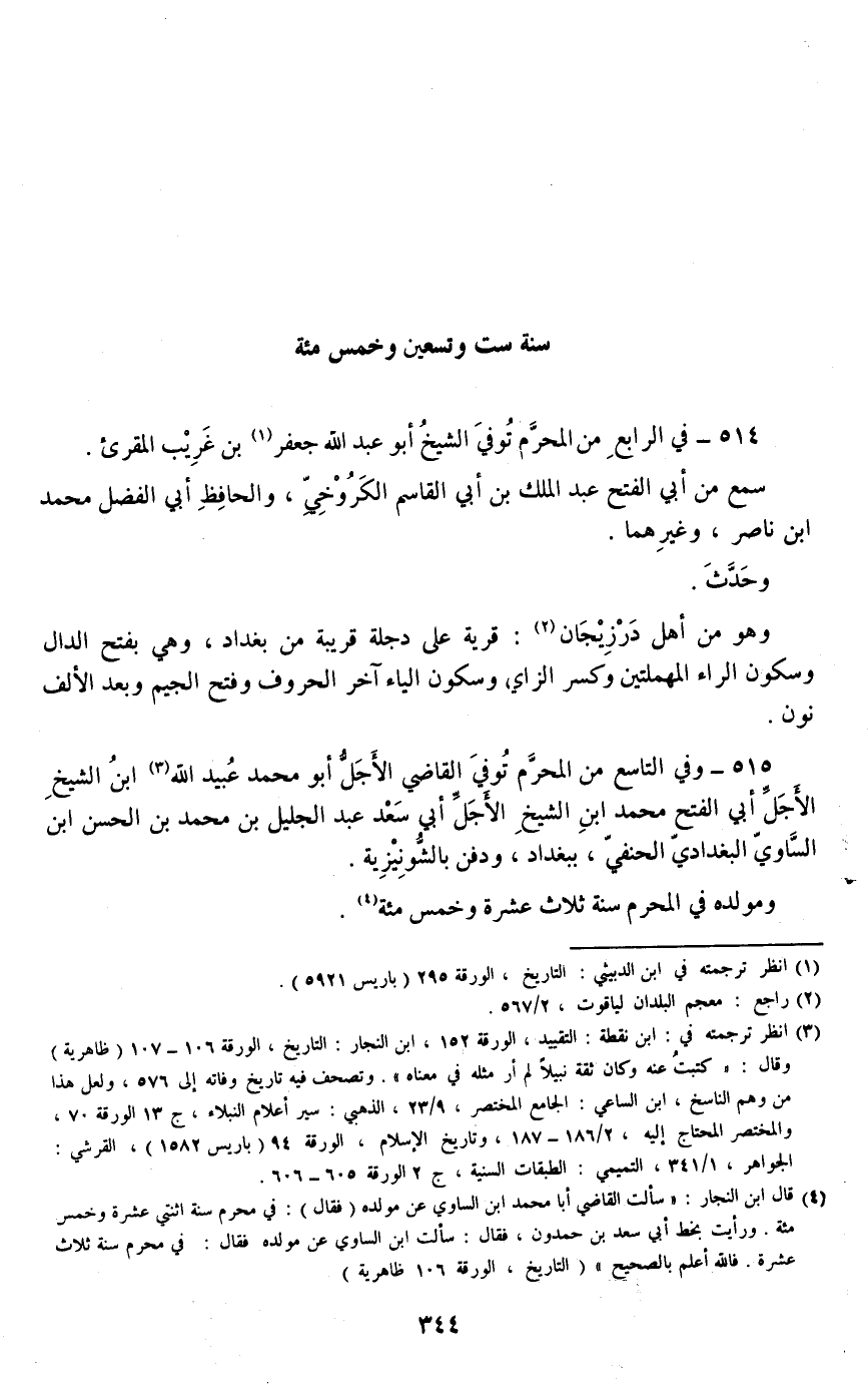 515 - وفي التاسع من المحرم توفي القاضي الأجل أبو محمد عبيد الله ابن الشيخ الأجل أبي الفتح محمد ابن الشيخ الأجل أبي سعد عبد الجليل بن محمد بن الحسن ابن الساوي البغدادي الحنفي، ببغداد ودفن بالشونيزية.