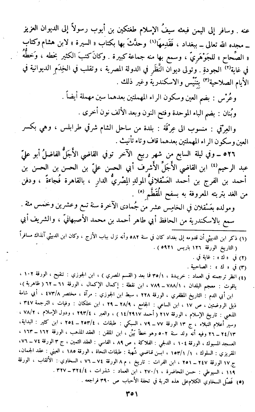 526 - وفي ليلة السابع من شهر ربيع الآخر توفي القاضي الأجل الفاضل أبو علي عبد الرحيم ابن القاضي الأجل الأشرف أبي الحسن علي بن الحسن بن الحسن بن أحمد بن الفرج بن أحمد العسقلاني المولد المصري الدار، بالقاهرة فجاءة، ودفن من الغد بتربته المعروفة به بسفح المقطم.