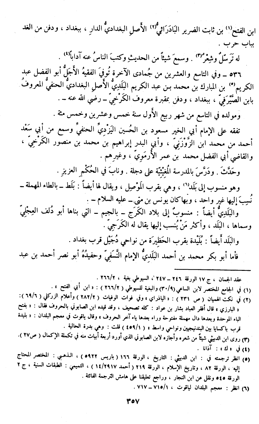 536 - وفي التاسع والعشرين من جمادى الآخرة توفي الفقيه الأجل أبو الفضل عبد الكريم بن المبارك بن محمد بن عبد الكريم البلدي الأصل البغدادي الحنفي المعروف بابن الصيرفي، ببغداد، ودفن بمقبرة معروف الكرخي –رضي الله عنه-.