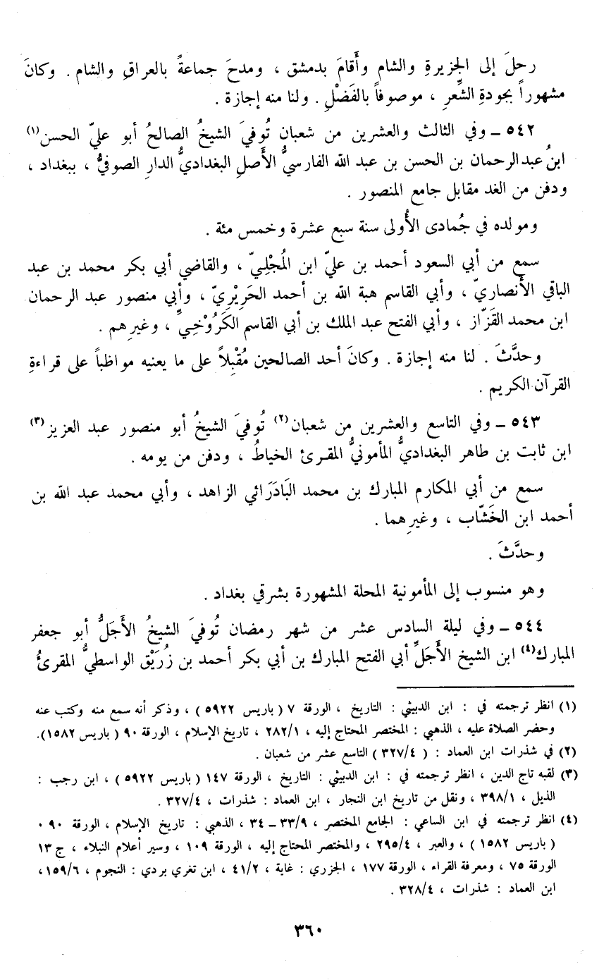 542 - وفي الثالث والعشرين من شعبان توفي الشيخ الصالح أبو علي الحسن بن عبد الرحمان بن الحسن بن عبد الله الفارسي الأصل البغدادي الدار الصوفي، ببغداد، ودفن من الغد مقابل جامع المنصور.