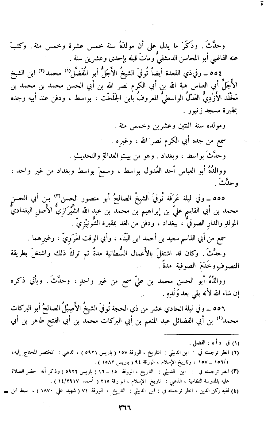 556 - وفي ليلة الحادي عشر من ذي الحجة توفي الشيخ الأصيل الصالح أبو البركات محمد بن أبي الفضائل عبد المنعم بن أبي البركات محمد بن أبي الفتح طاهر بن أبي طاهر سعيد بن أبي سعيد فضل الله بن أبي الخير الميهني الصوفي، #367# ببغداد، ودفن من الغد عند أبيه في صفة الجنيد –رضي الله عنهم-.