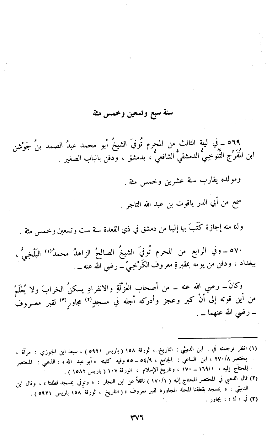 569 - في ليلة الثالث من المحرم توفي الشيخ أبو محمد عبد الصمد بن جوشن ابن المفرج التنوخي الدمشقي الشافعي، بدمشق، ودفن بالباب الصغير.