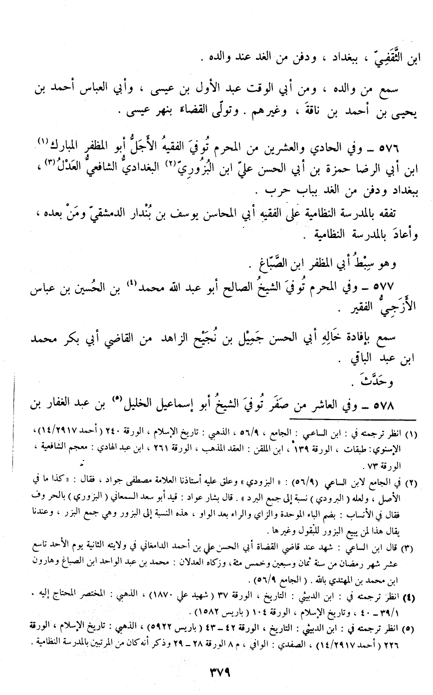 576 - وفي الحادي والعشرين من المحرم توفي الفقيه الأجل أبو المظفر المبارك بن أبي الرضا حمزة بن أبي الحسن علي ابن البزوري البغدادي الشافعي العدل، ببغداد ودفن من الغد بباب حرب.