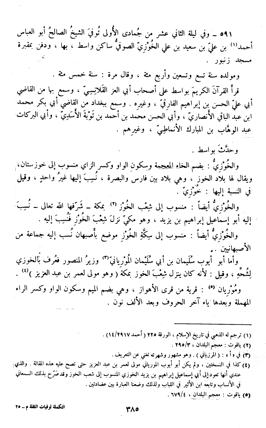 591 - وفي ليلة الثاني عشر من جمادى الأولى توفي الشيخ الصالح أبو العباس أحمد بن علي بن سعيد بن علي الخوزي الصوفي ساكن واسط، بها، ودفن بمقبرة مسجد زنبور.