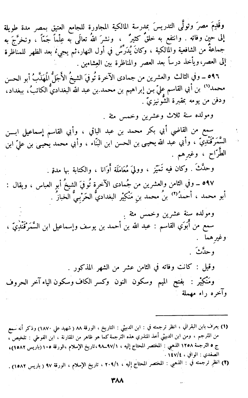 596 - وفي الثالث والعشرين من جمادى الآخرة توفي الشيخ الأجل المهذب أبو الحسن محمد بن أبي القاسم علي بن إبراهيم بن محمد بن عبد الله البغدادي الكاتب، ببغداد، ودفن من يومه بمقبرة الشونيزي.