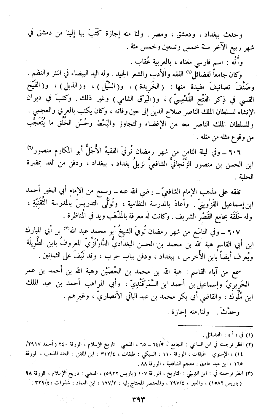 606 - وفي ليلة الثامن من شهر رمضان توفي الفقيه الأجل أبو المكارم منصور بن الحسن بن منصور الزنجاني الشافعي نزيل بغداد، ودفن من الغد بمقبرة الحلبة.