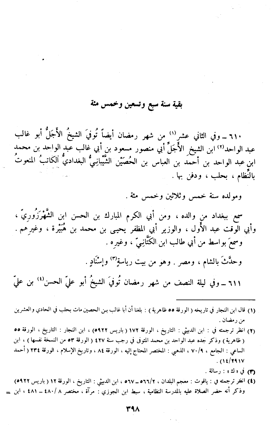 610 - وفي الثاني عشر من شهر رمضان أيضا توفي الشيخ الأجل أبو غالب عبد الواحد ابن الشيخ الأجل أبي منصور مسعود بن أبي غالب عبد الواحد بن محمد بن عبد الواحد بن أحمد بن العباس بن الحصين الشيباني البغدادي الكاتب المنعوت بالنظام، بحلب، ودفن بها.