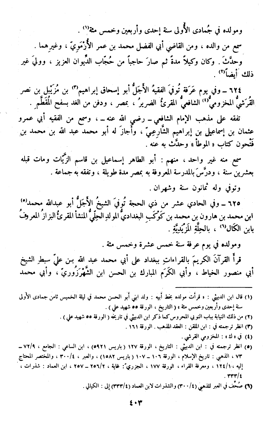 625 - وفي الحادي عشر من ذي الحجة توفي الشيخ الأجل أبو عبد الله محمد بن محمد بن هارون بن محمد بن كوكب البغدادي المولد الحلي المنشأ المقرئ البزاز المعروف بابن الكال، بالحلة المزيدية.