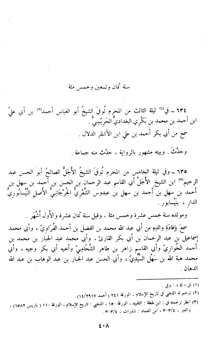 635 - وفي ليلة الخامس من المحرم توفي الشيخ الأجل الصالح أبو الحسن عبد الرحيم ابن الشيخ الأجل أبي القاسم عبد الرحمان بن الحسن بن أحمد بن سهل بن أحمد بن سهل بن أحمد بن سهل بن عبدوس الشعري الجرجاني الأصل النيسابوري الدار، بنيسابور.