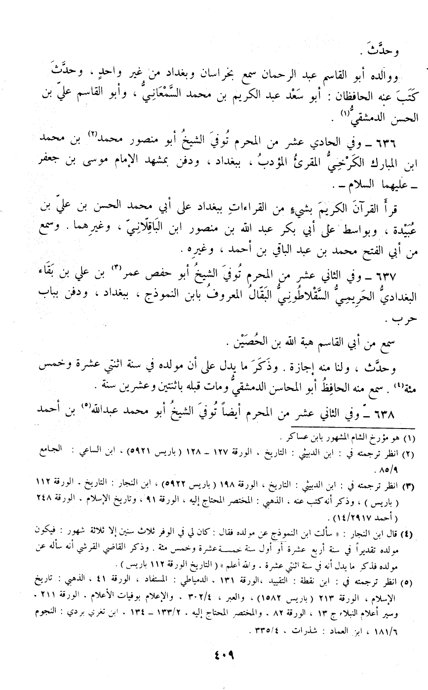 637 - وفي الثاني عشر من المحرم توفي الشيخ أبو حفص عمر بن علي بن بقاء البغدادي الحريمي السقلاطوني البقال المعروف بابن النموذج، ببغداد، ودفن بباب حرب.