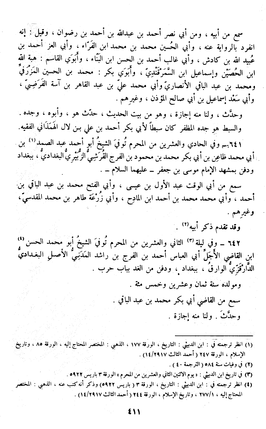 642 - وفي ليلة الثاني والعشرين من المحرم توفي الشيخ أبو محمد الحسن ابن القاضي الأجل أبي العباس أحمد بن الفرج بن راشد المدني الأصل البغدادي الدارقزي الوراق، ببغداد، ودفن من الغد بباب حرب.