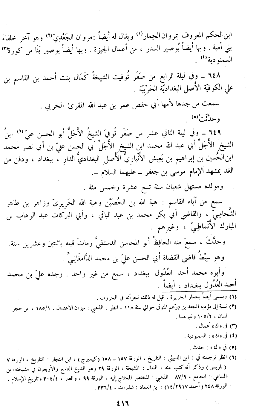 649 - وفي ليلة الثاني عشر من صفر توفي الشيخ الأجل أبو الحسن علي ابن الشيخ الأجل أبي عبد الله محمد ابن الشيخ الأجل أبي الحسن علي بن أبي نصر محمد بن الحسين بن إبراهيم بن يعيش الأنباري الأصل البغدادي الدار، ببغداد، ودفن من الغد بمشهد الإمام موسى بن جعفر –عليهما السلام-.