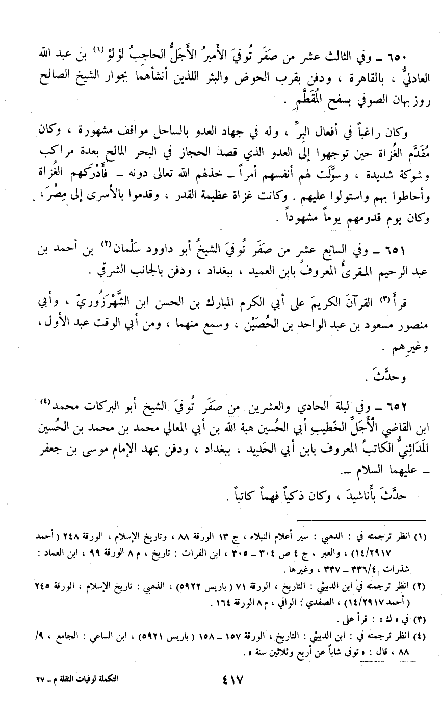 651 - وفي السابع عشر من صفر توفي الشيخ أبو داوود سلمان بن أحمد بن عبد الرحيم المقرئ المعروف بابن العميد، ببغداد، ودفن بالجانب الشرقي.