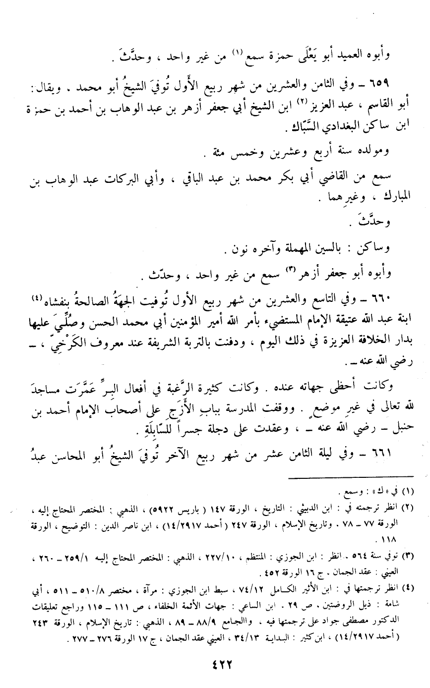 659 - وفي الثامن والعشرين من شهر ربيع الأول توفي الشيخ أبو محمد، ويقال: أبو القاسم، عبد العزيز ابن الشيخ أبي جعفر أزهر بن عبد الوهاب بن أحمد بن حمزة بن ساكن البغدادي السباك