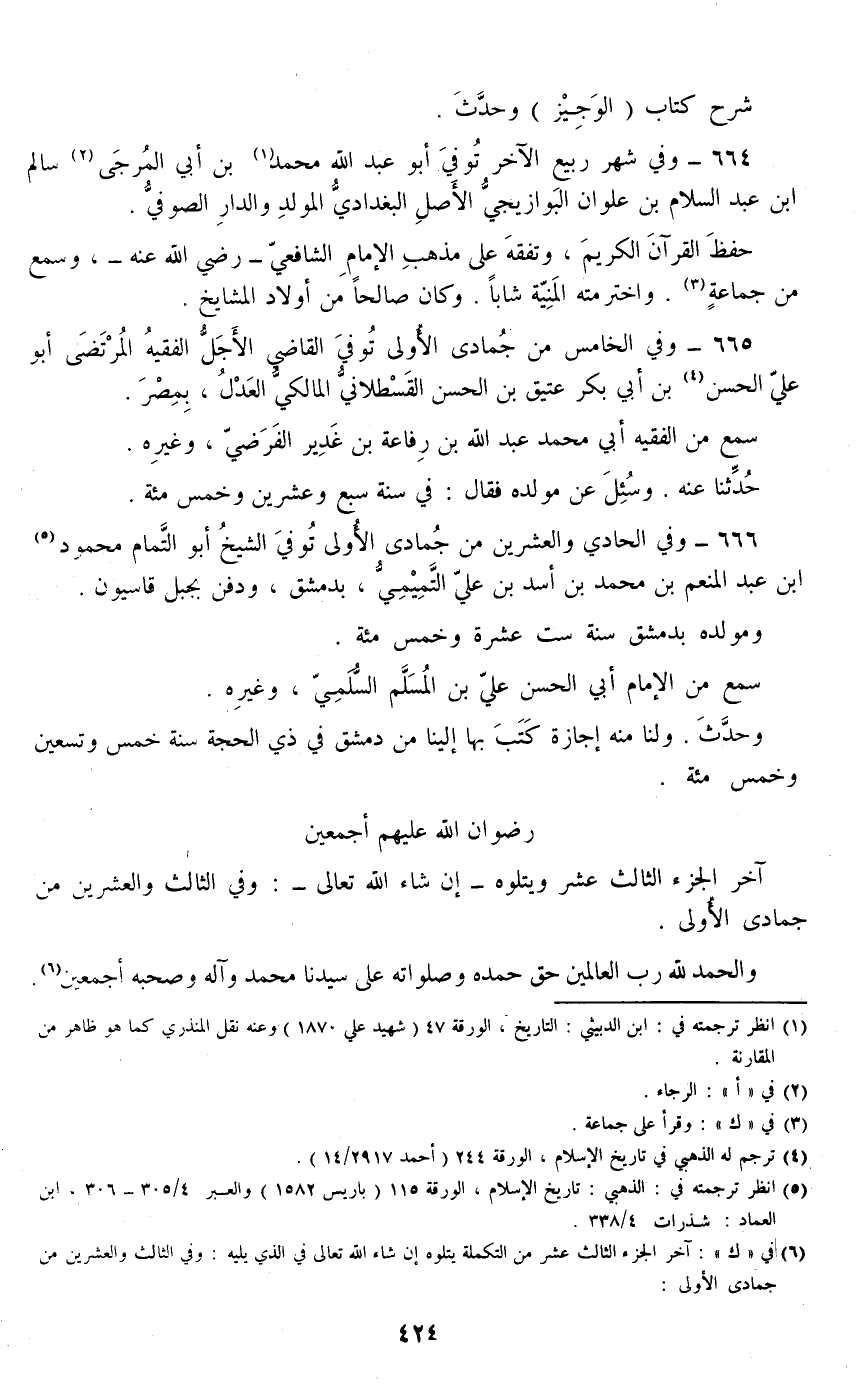 664 - وفي شهر ربيع الآخر توفي أبو عبد الله محمد بن أبي المرجى سالم بن عبد السلام بن علوان البوازيجي الأصل البغدادي المولد والدار الصوفي