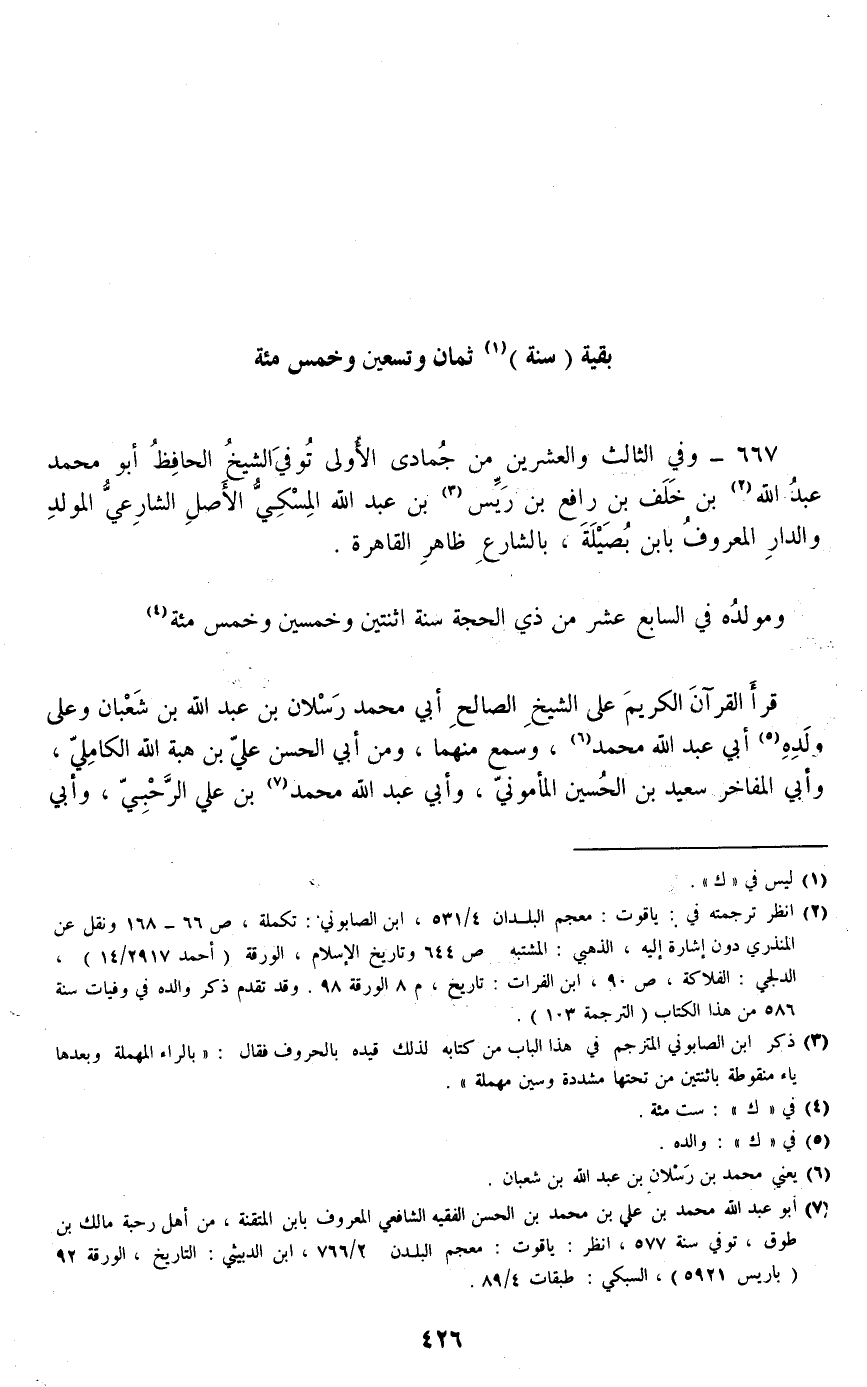 667 - وفي الثالث والعشرين من جمادى الأولى توفي الشيخ الحافظ أبو محمد عبد الله بن خلف بن رافع بن ريس بن عبد الله المسكي الأصل الشارعي المولد والدار المعروف بابن بصيلة، بالشارع ظاهر القاهرة.