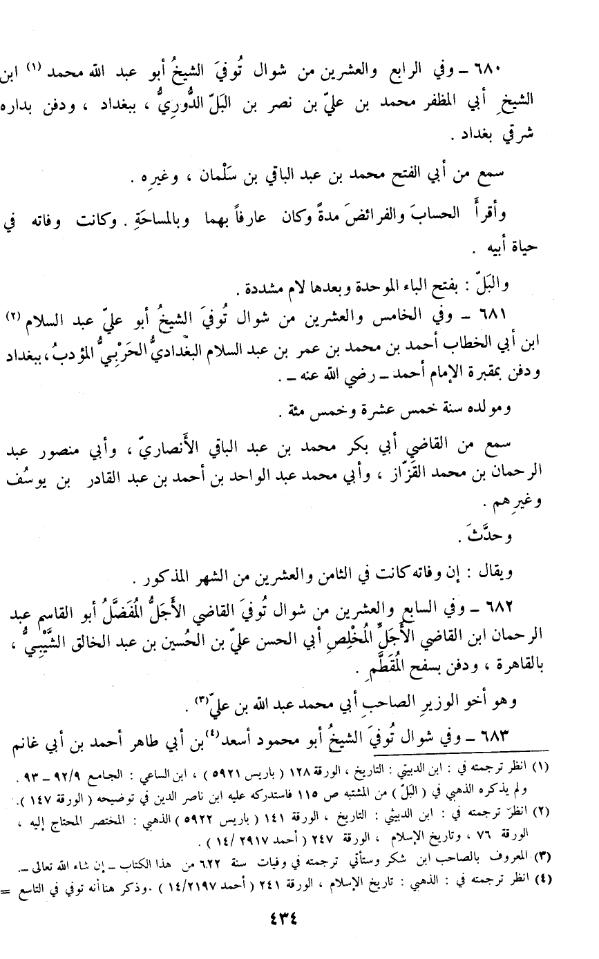 681 - وفي الخامس والعشرين من شوال توفي الشيخ أبو علي عبد السلام بن أبي الخطاب أحمد بن محمد بن عمر بن عبد السلام البغدادي الحربي المؤدب، ببغداد ودفن بمقبرة الإمام أحمد –رضي الله عنه-.