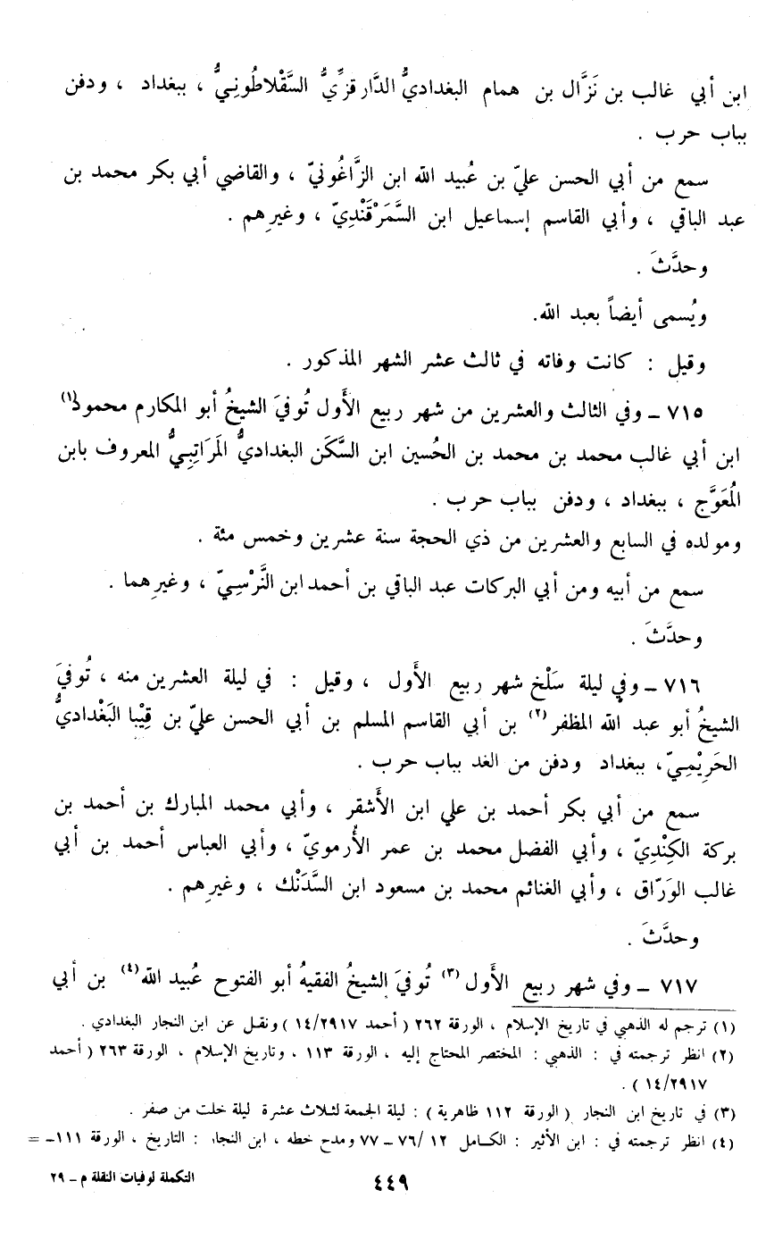 715 - وفي الثالث والعشرين من شهر ربيع الأول توفي الشيخ أبو المكارم محمود بن أبي غالب محمد بن محمد بن الحسين ابن السكن البغدادي المراتبي المعروف بابن المعوج، ببغداد، ودفن بباب حرب.