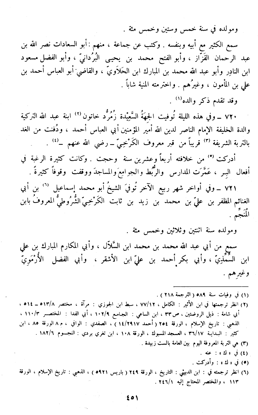 721 - وفي أواخر شهر ربيع الآخر توفي الشيخ أبو محمد إسماعيل بن أبي الغنائم المظفر بن علي بن محمد بن زيد بن ثابت الكرخي الشروطي المعروف بابن المنجم