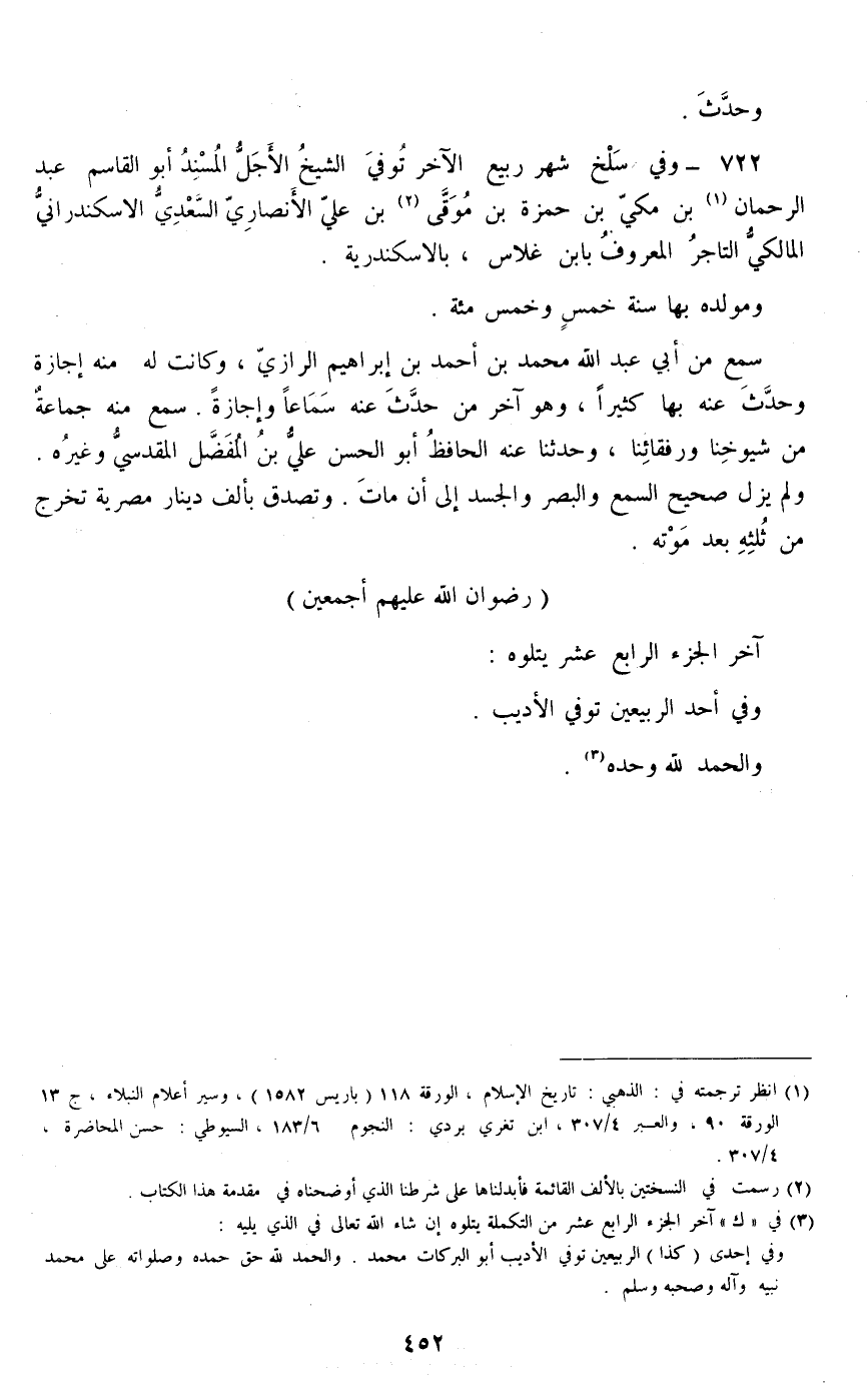 722 - وفي سلخ شهر ربيع الآخر توفي الشيخ الأجل المسند أبو القاسم عبد الرحمان بن مكي بن حمزة بن موقى بن علي الأنصاري السعدي الاسكندراني المالكي التاجر المعروف بابن غلاس، بالاسكندرية.