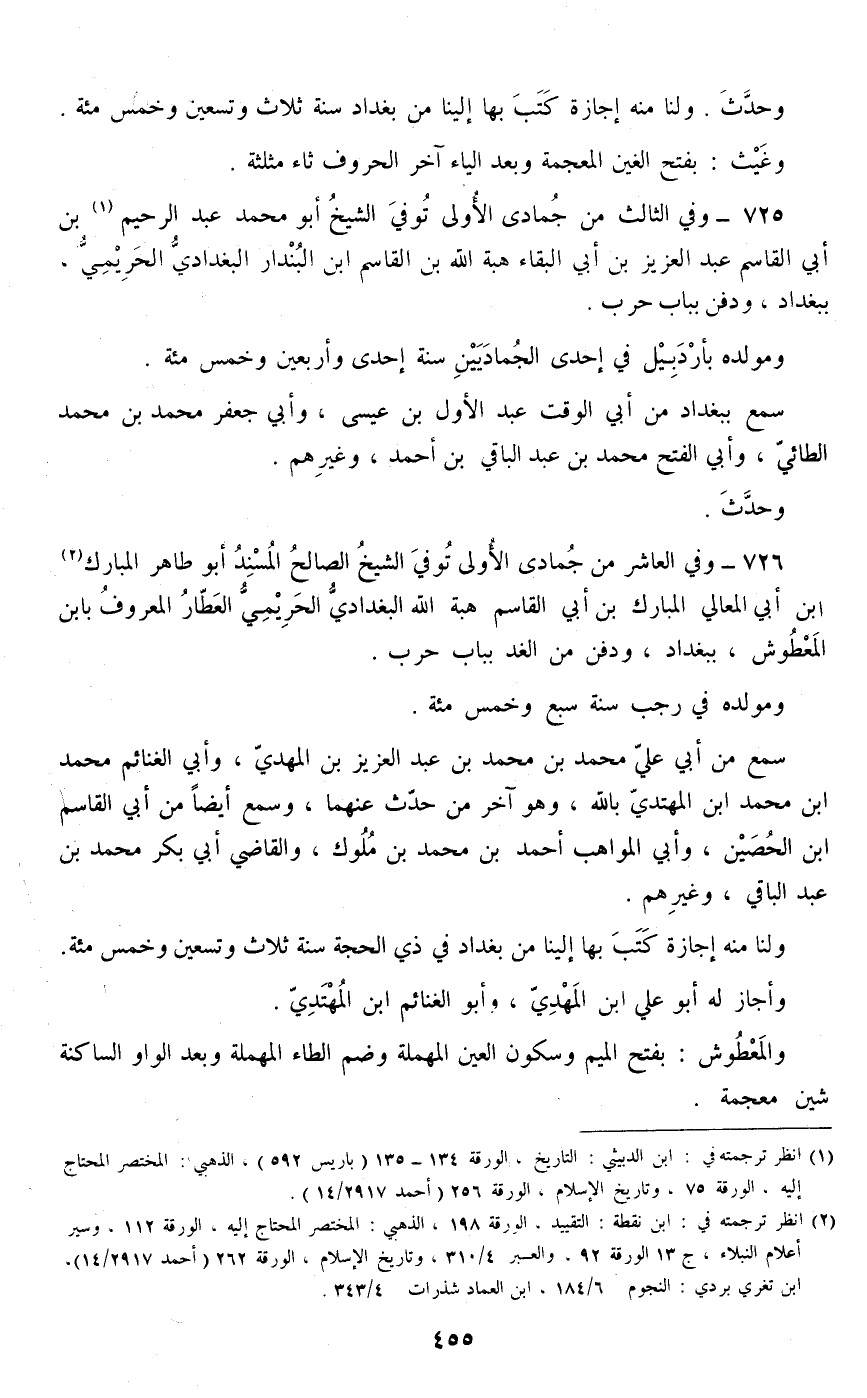 725 - وفي الثالث من جمادى الأولى توفي الشيخ أبو محمد عبد الرحيم بن أبي القاسم عبد العزيز بن أبي البقاء هبة الله بن القاسم ابن البندار البغدادي الحريمي، ببغداد، ودفن بباب حرب.