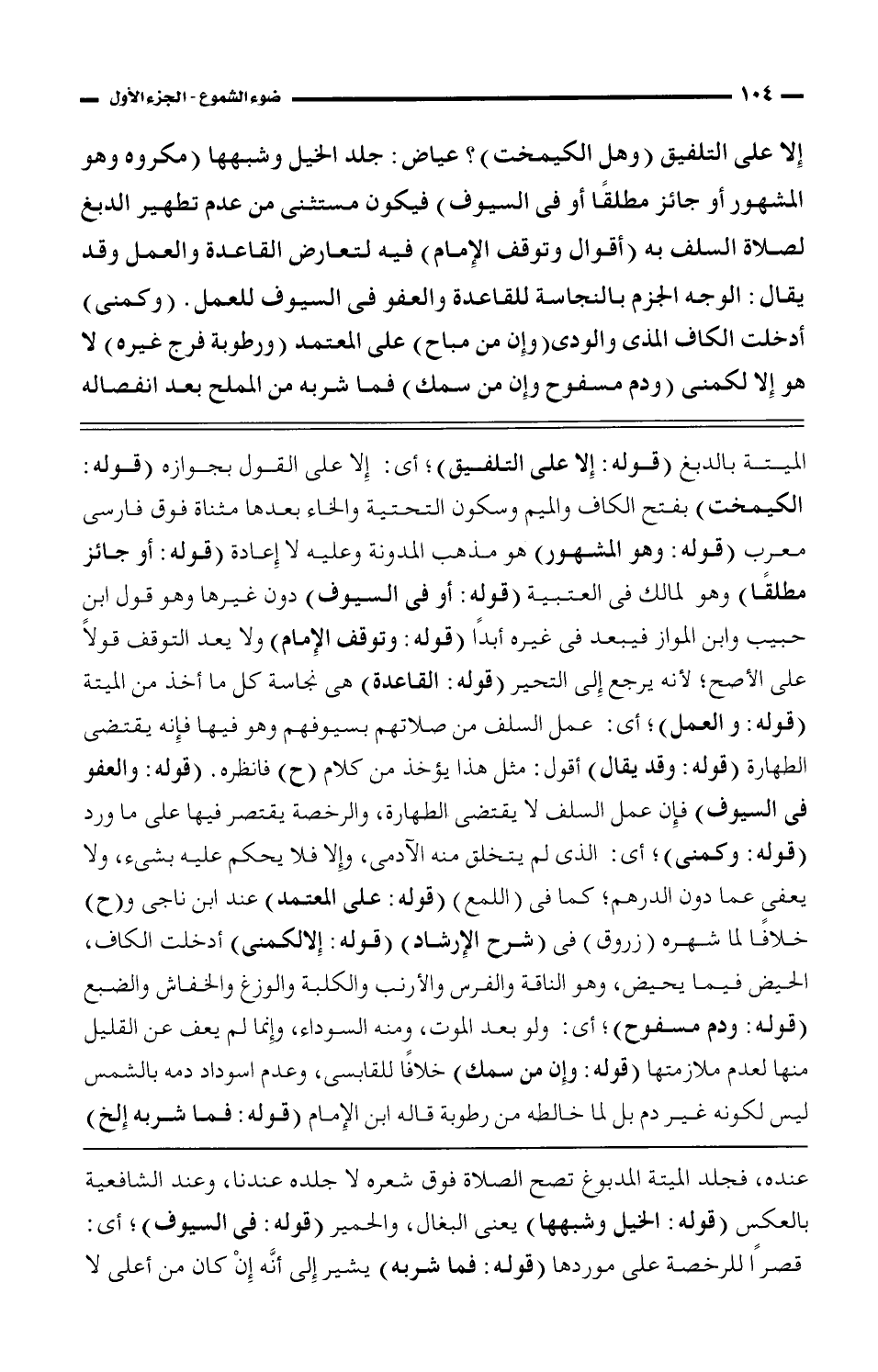 التلفيق (وهل الكيمخت)؟ عياض: جلد الخيل وشبهها (مكروه وهو المشهور أو جائز مطلقًا أو في السيوف) فيكون مستثنى من عدم تطهير الدبغ لصلاة السلف به (أقوال وتوقف الإمام) فيه لتعارض القاعدة والعمل وقد يقال: الوجه الجزم بالنجاسة للقاعدة والعفو فى السيوف للعمل. (وكمنى) أدخلت الكاف المذى والودى (وإن من مباح) على المعتمد (ورطوبة فرج غيره) لا هو إلا لكمنى (ودم مسفوح وإ ن من سمك) فما شربه من المملح بعد انفصاله نجس