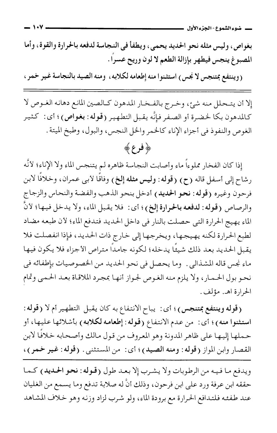 المؤلف: إلا أن يتحلل منه شئ، وخرج بالفخار المدهون كالصين المانع دهانه الغوص لا كالمدهون بكالخضرة أو الصفر فإنه يقبل التطهير (قوله: بغواص)؛ أى: كثير الغوص والنفوذ فى أجزاء الإناء كالخمر والخل النجس، والبول، وطبخ الميتة.