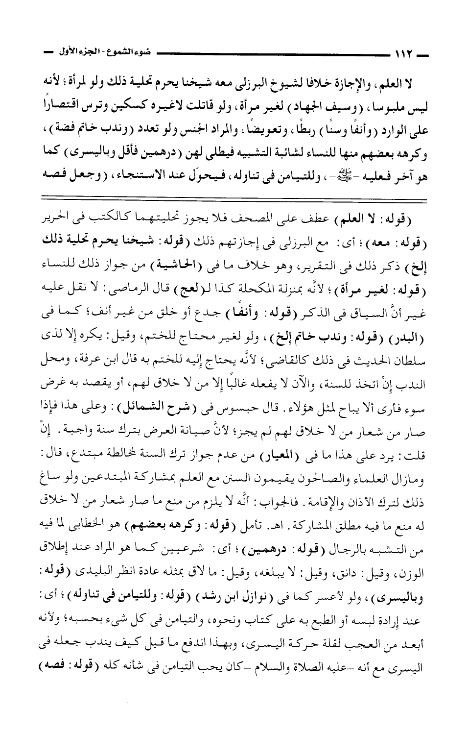 (قوله: لا العلم) عطف على المصحف فلا يجوز تحليتهما كالكتب في الحرير (قوله: معه)؛ أى: مع البرزلى فى إجازتهم ذلك (قوله: شيخنا يحرم تحلية ذلك إلخ) ذكر ذلك فى التقرير، وهو خلاف ما فى (الحاشية) من جواز ذلك للنساء (قوله: لغير مرأة)؛ لأنه بمنزلة المكحلة كذا لـ (لعج) قال الرماصى: لا نقل عليه غير أن السياق فى الذكر (قوله: وأنفًا) جدع أو خلق من غير أنف؛ كما فى (البدر) (قوله: وندب خاتم إلخ)، ولو لغير محتاج للختم، وقيل: يكره إلا لذى سلطان الحديث فى ذلك كالقاضى؛ لأنه يحتاج إله للختم به قال ابن عرفة، ومحل الندب إن اتخذ للسنة، والآن لا يفعله غالبًا إلا من لا خلاق لهم، أو يقصد به غرض سوء فأرى ألا يباح لمثل هؤلاء. قال حبسوس فى (شرح الشمائل): وعلى هذا فإذا صار من شعار من لا خلاق لهم لم يجز؛ لأن صيانة العرض بترك سنة واجبة. إن قلت: يرد على هذا ما فى (المعيار) من عدم جواز ترك السنة المخالطة مبتدع، قال: ومازال العلماء والصالحون يقيمون السنن مع العلم بمشاركة المبتدعين ولو ساغ ذلك لترك الأذان والإقامة. فالجواب: أنه لا يلزم من منع ما صار شعار من لا خلاق له منع ما فيه مطلق المشاركة. اهـ. تأمل (قوله: وكرهه بعضهم) هو الخطابى لما فيه من التشبيه بالرجال (قوله: درهمين)؛ أى: شرعيين كما هو المراد عند إطلاق الوزن، وقي: دانق، وقيل: لا يبلغه، وقيل: ما لاق بمثله عادة انظر البليدى (قوله: وباليسرى)، ولو لأعسر كما فى (نوازل ابن رشد) (وقوله: وللتيامن فى تناوله)؛ أى: عند إرادة لبسه أو الطبع به على كتاب ونحوه، والتيامن فى كل شئ بحسبه؛ ولأنه أبعد من العجب لقلة حركة اليسرى، وبهذا اندفع ما قيل كيف يندب جعله فى اليسرى مع أنه -عليه الصلاة والسلام- كان يحب التيامن فى شأنه كله (قوله: فصه