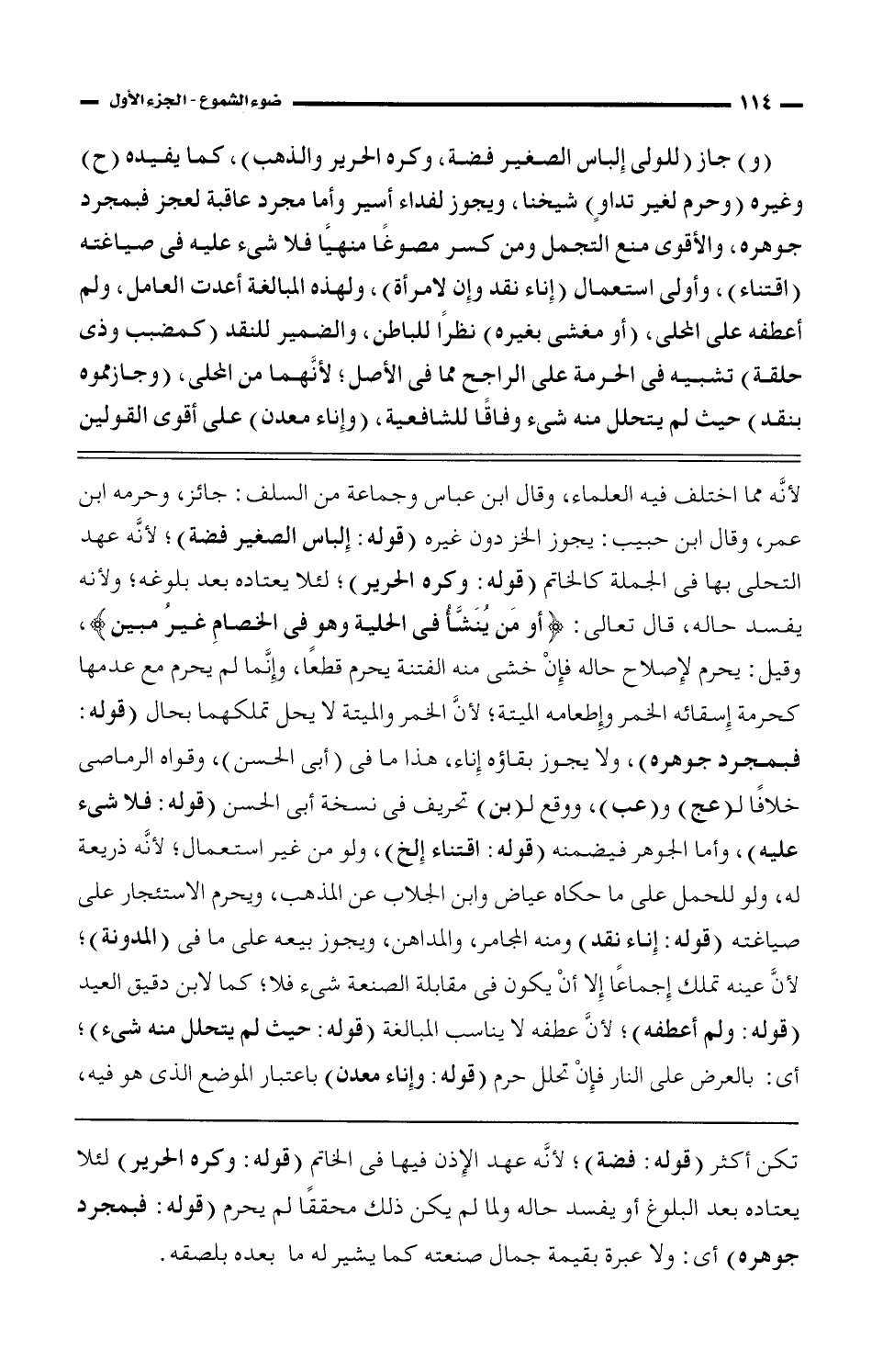 لأنه مما اختلف فيه العلماء، وقال ابن عباس وجماعة من السلف: جائز، وحرمه ابن عمر، وقال ابن حبيب: يجوز الخز دون غيره (قوله: إلباس الصغير فضة)؛ لأنه عهد التحلى بها فى الجملة كالخاتم (قوله: وكره الحرير)؛ لئلا يعتاده بعد بلوغه؛ ولأنه يفسد حاله، قال تعالى: {أو من ينشأ في الحلية وهو فى الخصام غير مبين}، وقيل: يحرم لإصلاح حاله فإن خشى من الفتنة يحرم قطعًا، وإنما لم يحرم مع عدمها كحرمة إسقائه الخمر وإطعامه الميتة؛ لأن الخمر والميتة لا يحل تملكهما بحال (قوله: فبمجرد جوهره)، ولا يجوز بقاؤه إناء، هذا ما فى (أبى الحسن)، وقواه الرماصى خلافًا لـ (عج) و (عب)، ووقع لـ (بن) تحريف فى نسخة أبى الحسن (قوله: فلا شئ عليه)، وأما الجوهر فيضمنه (قوله: اقتناء إلخ)، ولو من غير استعمال؛ لأنه ذريعة له، ولو للحمل على ما حكاه عياش وابن الجلاب عن المذهب، ويحرم الاستئجار على صياغته (قوله: إناء نقد) ومنه المجامر، والمداهن، ويجوز بيعه على ما فى (المدونة)؛ لأن عينه تملك إجماعًا إلا أن يكون فى مقابلة الصنعة شئ فلا؛ كما لابن دقيق العيد (قوله: ولم أعطفه)؛ لأن عطفه لا يناسب المبالغة (قوله: حيث لم يتحلل منه شئ)؛ أى: بالعرض على النار فإن تحلل حرم (قوله: وإناء معدن) باعتبار الموضع الذى هو فيه،