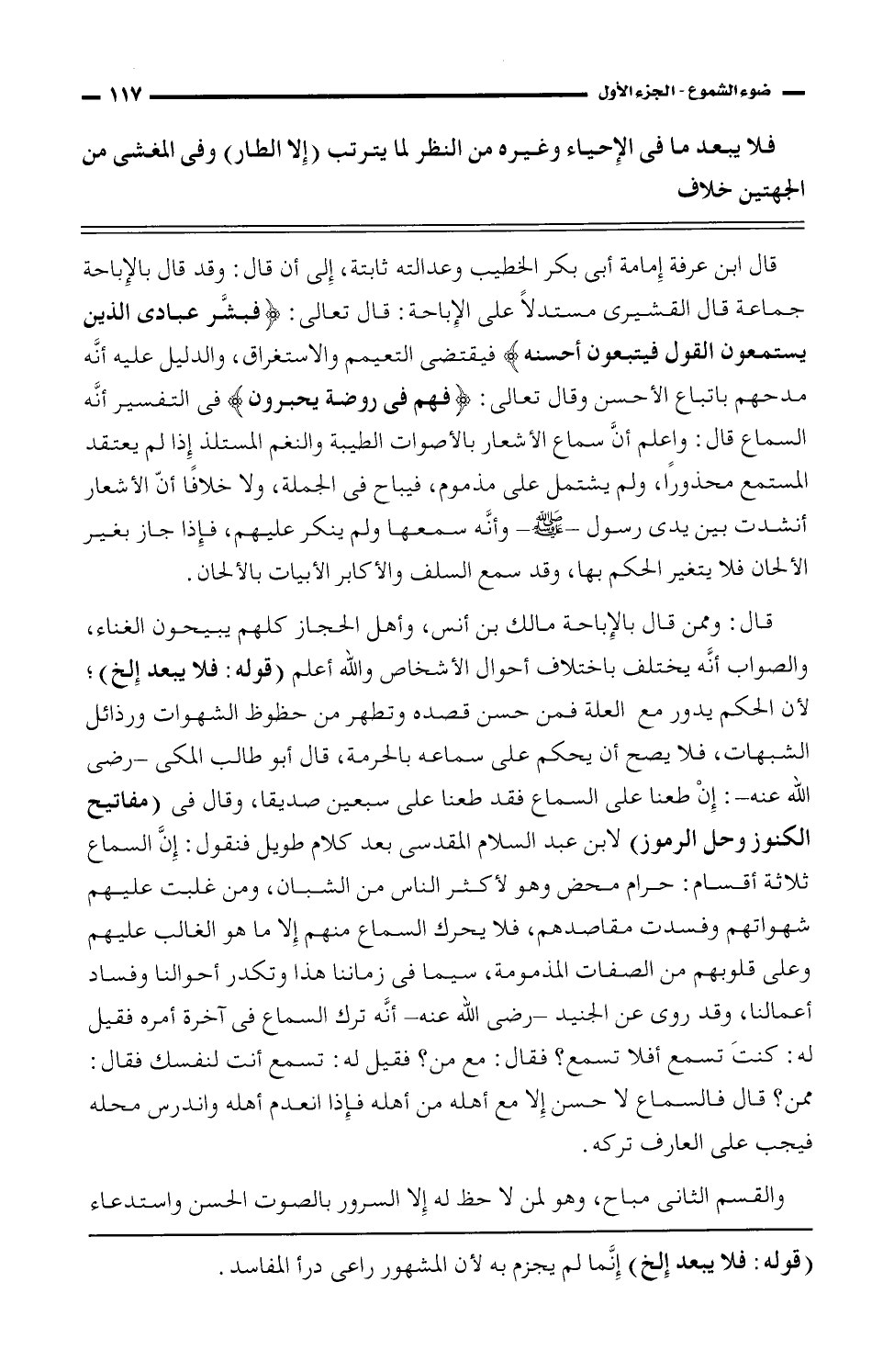 قال: وممن قال بالإباحة مالك بن أنس، وأهل الحجاز كلهم يبيحون الغناء، والصواب أنه يختلف باختلاف أحوال الأشخاص، والله أعلم (قوله: فلا يبعد إلخ)؛ لأن الحكم يدور مع العلة فمن حسن قصده وتطهر من حظوظ الشهوات ورذائل الشبهات، فلا يصح أن يحكم على سماعه بالحرمة، قال أبو طالب المكى -رضى الله عنه-: إن طعنا على السماع فقد طعنا على سبعين صديقًا، وقال فى (مفاتيح الكنوز وحل الرموز) لابن عبد السلام المقدسى بعد كلام طويل فنقول: إن السماع ثلاثة أقسام: حرام محض وهو لأكثر الناس من الشبان، ومن غلبت عليهم شهواتهم وفسدت مقاصدهم، فلا يحرك السماع منهم إلا ما هو الغالب عليهم وعلى قلوبهم من الصفات المذمومة، سيما في زماننا هذا وتكدر أحوالنا وفساد أعمالنا، وقد روى عن الجنيد -رضى الله عنه- أنه ترك السماع فى آخر أمره فقيل له: كنت تسمع أفلا تسمع؟ فقال: مع من؟ فقيل له: تسمع أنت لنفسك فقال: ممن؟ قال: فالسماع لا حسن إلا مع أهله مع أهله فإذا انعدم أهله واندرس محله فيجب على العارف تركه.