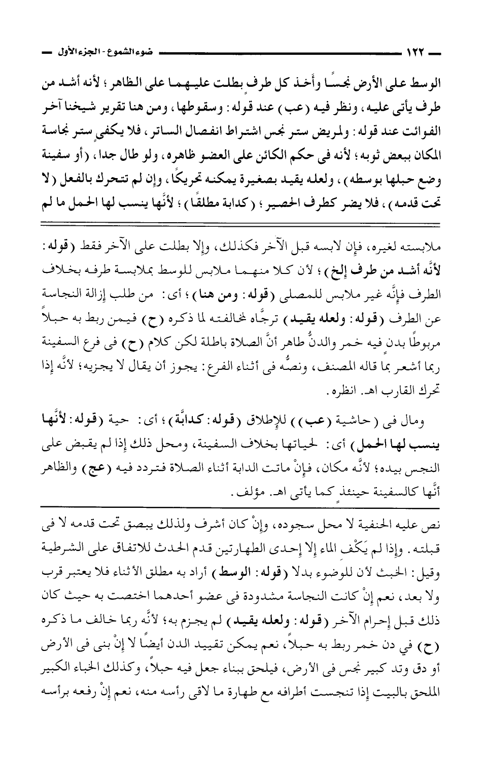 نص عليه الحنفية لا محل سجوده، وإن كان أشرف ولذلك يبصق تحت قدمه لا فى قبلته. وإذا لم يكف الماء إلا إحدى الطهارتين قدم الحدث للاتفاق على الشرطية وقيل: الخبث لأن الوضوء بدلًا (قوله: الوسط) أراد به مطلق الأثناء فلا يعتبر قرب ولا بعد، نعم إن كانت النجاسة مشدودة فى غضو أحدهما اختصت به حيث كان ذلك قبل إحرام الآخر (قوله: ولعله يقيد) لم يجزم به؛ لأنه ربما خالف ما ذكره (ح) فى دن خمر ربط به حبلًا، نعم يمكن تقييد الدن أيضًا لا إن بنى فى الأرض أو دق وتدًا كبيرًا نجس فى الأرض، فيلحق ببناء جعل فيه حبلًا، وكذلك الخباء الكبير الملحق بالبيت إذا تنجست أطرافه مع طهارة ما لاقى رأسه منه، نعم إن رفعه