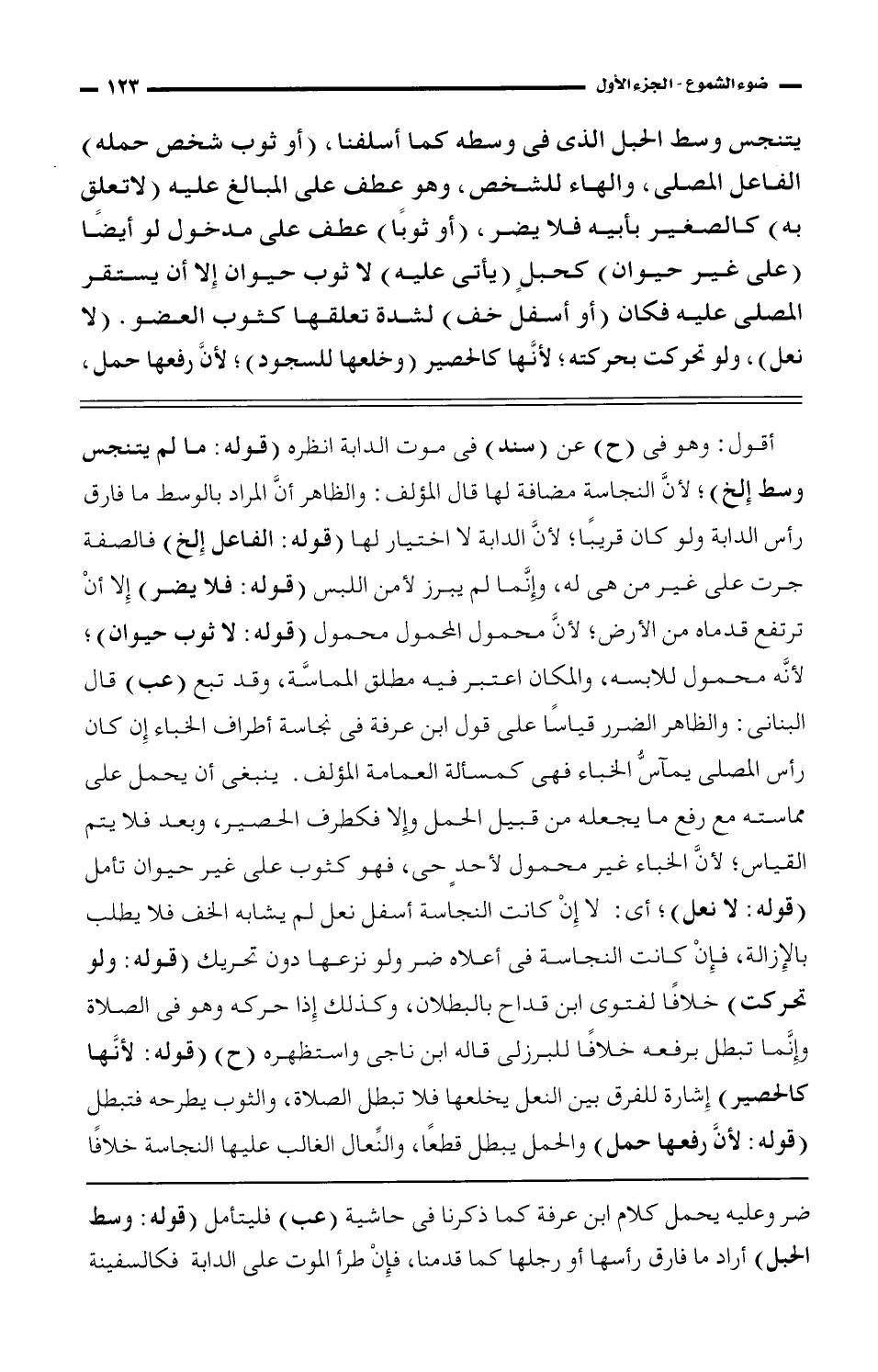 أقول: وهو فى (ح) عن (سند) فى موت الدابة انظره (قوله: ما لم يتنجس وسط إلخ)؛ لأن النحاسة مضافة لها قال المؤلف: والظاهر أن المراد بالوسط ما فارق رأس الدابة ولو كان قريبًا؛ لأن الدابة لا اختيار لها (قوله: الفاعل إلخ) فالصفة جرت على غير من هى له، وإنما لم يبرز لأمن اللبس (قوله: فلا يضر) إلا أن ترتفع قدماه من الأرض؛ لأن محمول المحمول محمول (قوله: لا ثوب حيوان)؛ لأنه محمول للابسه، والمكان اعتبر فيه مطلق المماسة، وقد تبع (عب) قال البنانى: والظاهر الضرر قياسًا على قول ابن عرفة فى نجاسة أطراف الخباء إن كان رأس المصلى يمآس الخباء فهى كمسألة العمامة. المؤلف: ينبغى أن يحمل على مماسته مع رفع ما يجعله من قبيل الحمل وإلا فكطرف الحصير، وبعد فلا يتم القياس؛ لأن الخباء غير محمول لأحدٍ حى، فهو كثوب على غير حيوان تأمل (قوله: لا نعل)؛ أى: لا إن كانت النجاسة أسفل نعل لم يشابه الخف فلا يطلب بالإزالة، فإن كانت النجاسة فى أعلاه ضر ولو نزعها دون تحريك (قوله: ولو تحركت) خلافًا لفتوى ابن قداح بالبطلان، وكذلك إذا حركه وهو فى الصلاة وإنما تبطل برفعه خلافًا للبرزلى قال ابن ناجى واستظهره (ح) (قوله: لأنها كالحصير) إشارة للفرق بين النعل يخلعها فلا تبطل الصلاة، والثوب يطرحه فتبطل (قوله: لأن رفعها حمل) والحمل يبطل قطعًا، والنعال الغالب عليها النجاسة خلافًا