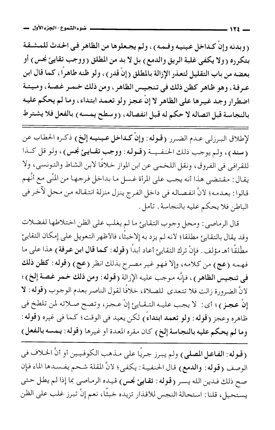 فكالسفينة (قوله: الفاعل المصلى) ولم يبرز جريًا على مذهب الكوفيين أو أن الخلاف فى الوصف (قوله: والدمع) قال الحنفية: يكفى؛ لأن لعقلة شحم يفسدها الماء فإن صح ذلك فدين الله يسر (قوله: تقايئ نجس) قيده الرماصى بما إذا لم يطل حتى يستحيل، قلنا: استحالة النجس للأقذار تزيده خبثًا، نعم إن تبرز غلب على الظن
