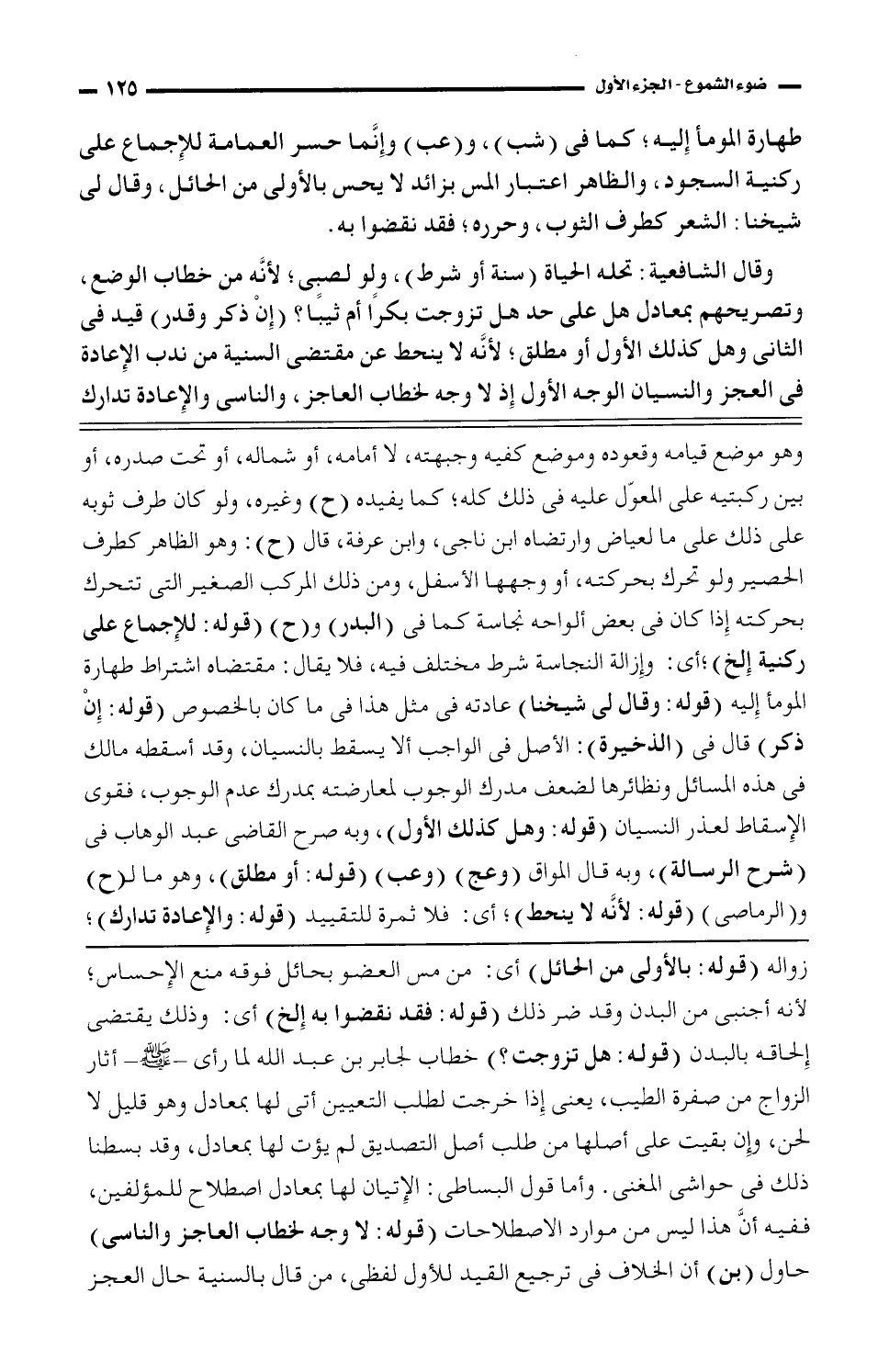 زواله (قوله: بالأولى من الحائل) أى: من مس العضو بحائل فوقه منع الإحساس؛ لأنه أجنبى من البدن وقد ضر ذلك (قوله: فقد نقضوا به إلخ) أى: وذلك يقتضى إلحاقه بالبدن (قوله: هل تزوجت؟ ) خطاب لجابر بن عبد الله لما رأى -صلى الله عليه وسلم- آثار الزواج من صفرة الطيب، يعنى إذا خرجت لطلب التعيين أتى لها بمعادل وهو قليل لا لحن، وإن بقيت على أصلها من طلب أصل التصديق لم يؤت لها بمعادل، وقد بسطنا ذلك فى حواشى المغنى. وأما قول البساطى: الإتيان لها بمعادل اصطلاح للمؤلفين، ففيه أن هذا ليس من موارد الاصطلاحات (قوله: لا وجه لخطاب العاجز والناسى) حاول (بن) أن الخلاف فى ترجيع القيد الأول لفظى، ومن قال بالسنية حال العجز