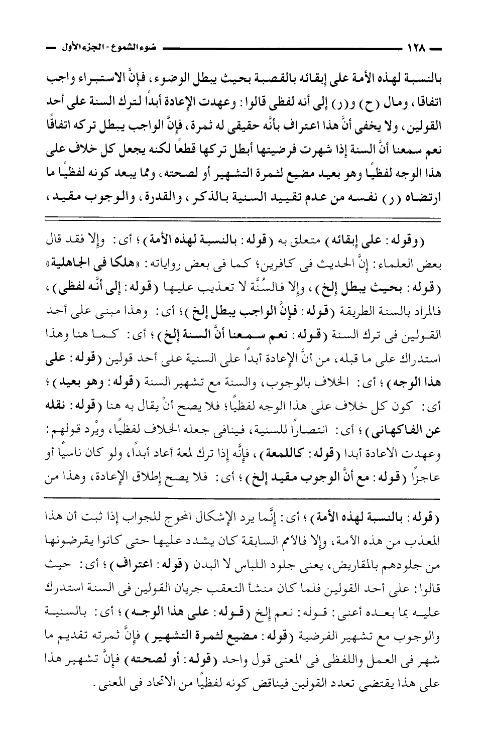 (وقوله: على إبقائه) متعلق به (قوله: بالنسبة لهذه الأمة)؛ أى: وإلا فقد قال بعض العلماء: إن الحديث فى كافرين؛ كما فى بعض رواياته: "هلكا فى الجاهلية" (قوله: بحيث يبطل إلخ)، وإلا فالسنة لا تعذيب عليها (قوله: إلى أنه لفظى)، فالمراد بالسنة الطريقة (قوله: فإن الواجب يبطل إلخ)؛ أى: وهذا مبنى على أحد القولين فى ترك السنة (قوله: نعم سمعنا أن السنة إلخ)؛ أى: كما هنا وهذا استدراك على ما قبله، من أن الإعادة أبدًا على السنية على أحد قولين (قوله: على هذا الوجه)؛ أى: الخلاف بالوجوب، والسنة مع تشهير السنة (قوله: وهو بعيد)؛ أى: كون كل خلاف على هذا الوجه لفظيًا؛ فلا يصح أن يقال به هنا (قوله: نقله عن الفاكهانى)؛ أى: انتصارًا للسنية، فينافى جعله الخلاف لفظيًا، ويرد قولهم: وعهدت الإعادة أبدًا (قوله: كاللمعة)، فإنه إذا ترك لمعة أعاد أبدًا، ولو كان ناسيًا أو عاجزًا (قوله: مع أن الوجوب مقيد إلخ)؛ أي: فلا يصح طلاق الإعادة، وهذا من